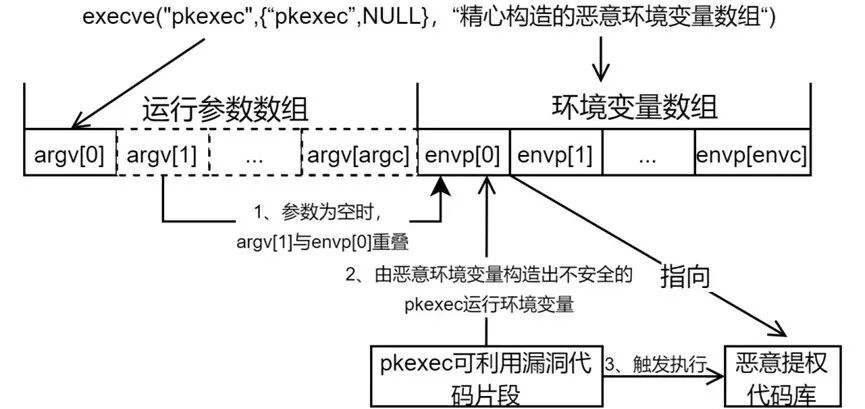 PolKit漏洞源于PolicyKit包中的pkexec工具,pkexec程序是一个类sudo可执行程序,具有root级的SUID权限,此程序允许普通用户以其他用户的身份执行命令。由于pkexec基本在所有的Linux系统上都有安装,而且此漏洞存在已久,并且恰巧pkexec具有SUID权限,导致此漏洞对Linux系统的安全产生了很大的威胁。PolKit漏洞形成的原因为pkexec程序没有对选项为空的情形进行判断,而直接便对argv[1]选项变量进行赋值,导致越界对环境变量进行了赋值,从而利用构建不安全的环境变量实现对漏洞的提权。如下图1所示: