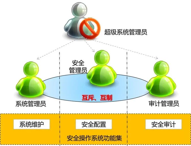 类UNIX操作系统中通常只有两类用户:超级用户和普通用户,超级用户具有管理系统的全部权利。一旦用户被攻破,将可能对系统造成极大的损害。三权分立机制把超级用户的权限按照进行细分为三个管理员用户:系统管理员、安全管理员和审计管理员。其中: