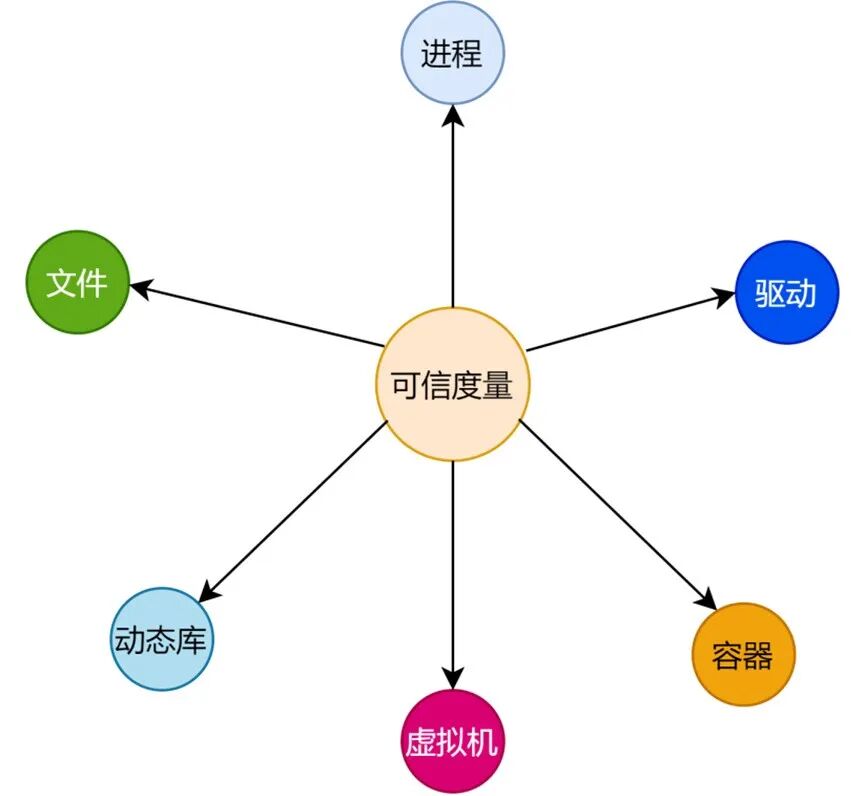 可信度量功能负责对系统中的进程、文件、动态库虚拟机、容器和驱动等进行完整性度量,防止这些客体在存储或者运行时被篡改。