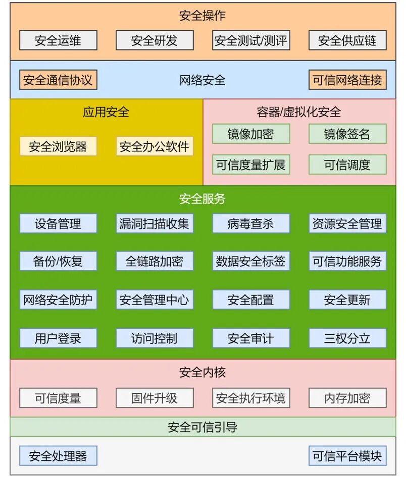 安全操作系统需要满足操作系统的整体性安全需求,从底向上在操作系统的多层级、多维度上构建安全防护功能,同时建立安全和可信边界。操作系统是一种复杂的软件系统,其融合了各种软件功能,从桌面操作系统、服务器操作系统、移动智能操作系统、嵌入式操作系统等分类上即可知其有多复杂,这么复杂的系统单单从单层级或者单维度来构建安全显然无法有效解决安全问题。操作系统的复杂性使得操作系统暴露给攻击者很多的攻击面–比如软件攻击、硬件设备攻击、固件攻击等,为了有效对操作系统进行安全防护,需要在多层次、多维度上构建安全,形成操作系统的整体安全防护体系。
