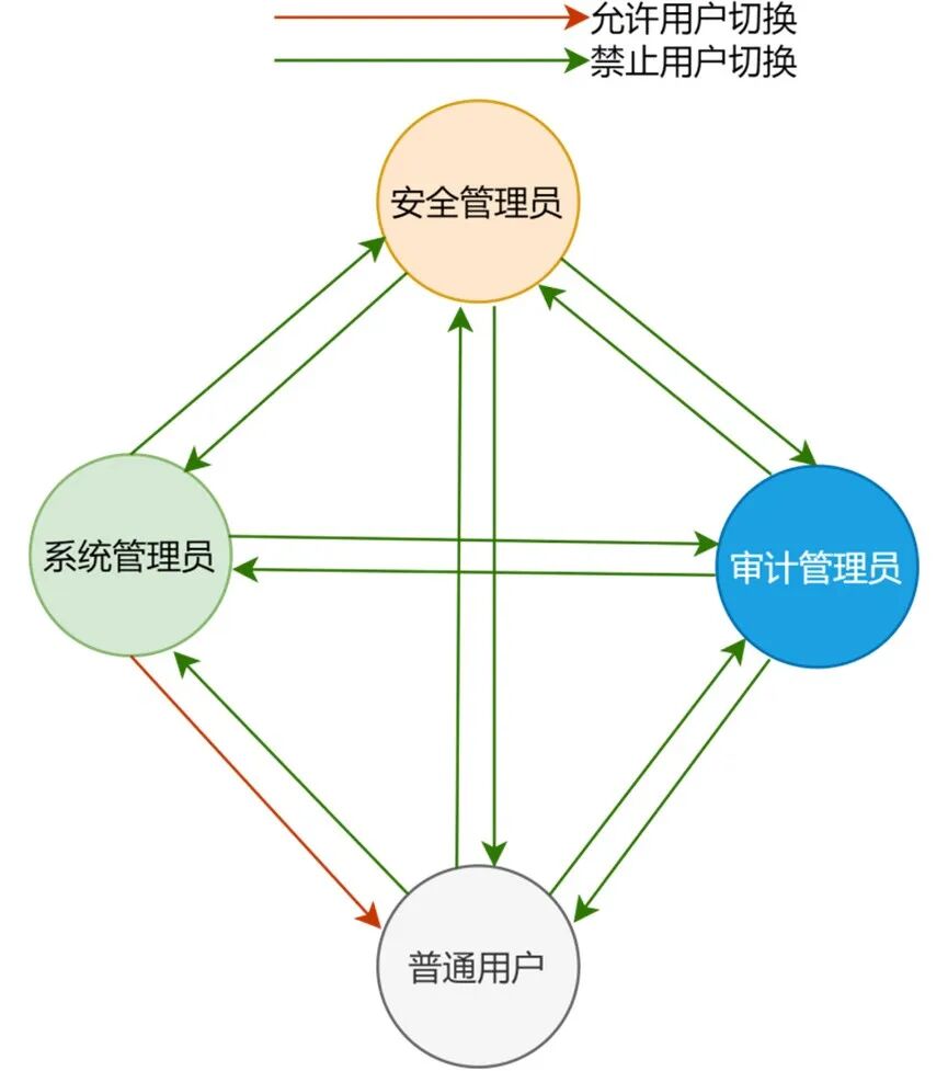 在安全操作系统的三权分立用户模型中,三个管理员用户无法相互进行用户身份切换,同时普通用户向管理员用于的身份切换也是被禁止的,如下图所示: