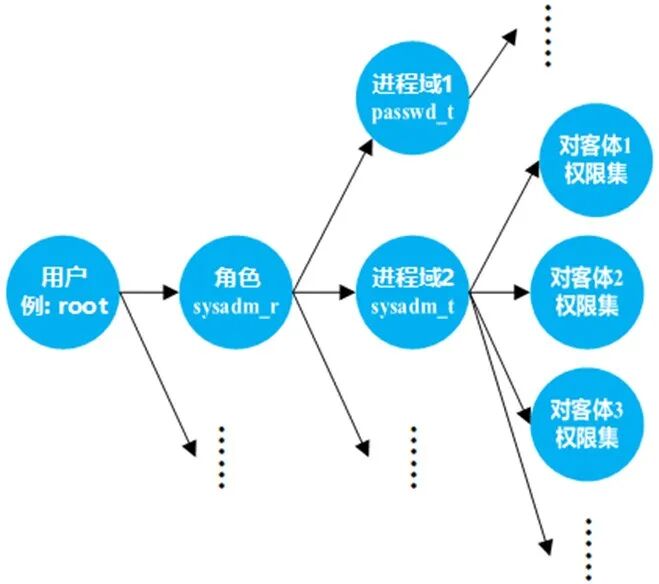 安全操作系统基于RBAC模型将原Linux超级用户(root)的特权分解成3个特权角色,初始安装时,系统将它们缺省组合成三个特权集合(角色),即系统管理员(sysadm_r)、安全管理员(secadm_r)、审计管理员(auditadm_r),并分别赋于了三个不同用户。当然,原则上可以根据需要任意组合其他角色,但必须使每一个角色,仅拥有完成其管理工作所需的最小特权。RBAC中用户关联角色,角色关联操作进程,进程关联对客体的操作权限,最终实现对用户权限的控制,如图所示: