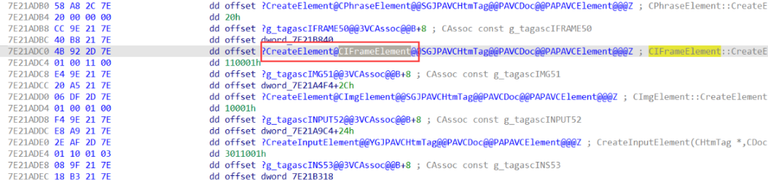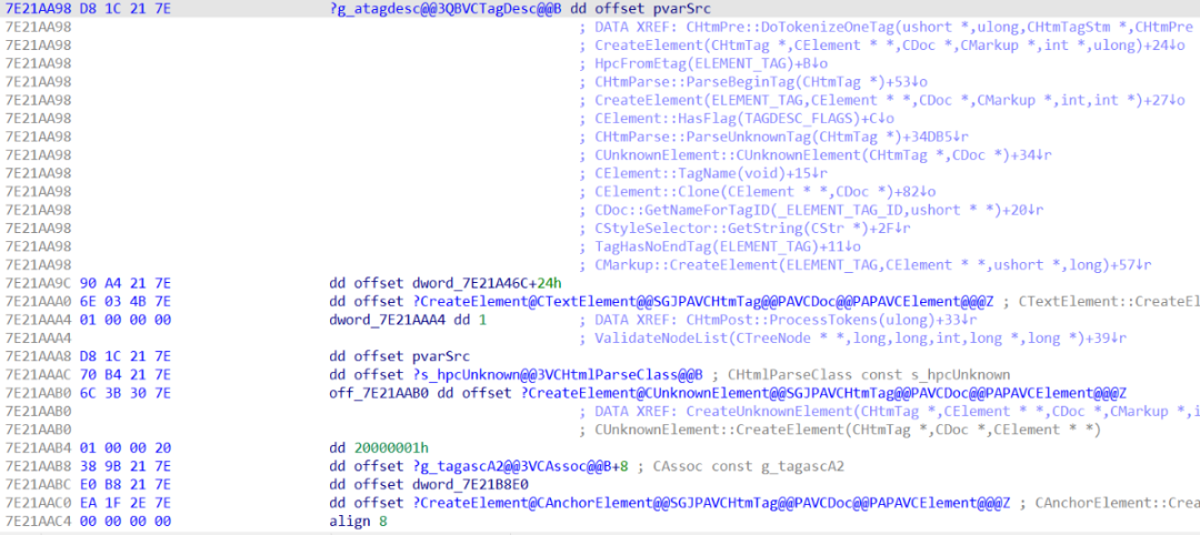 我们已经弄清了漏洞的成因,所以我们尝试在windbg中观察漏洞的形成过程,看看事件对象是如何创建和保存的。其实在mshtml模块中是存在有一个用于创建不同元素的函数表的,它的地址是 7e21aa98。