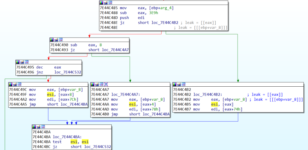通过栈回溯,在IDA中跳转到地址 7E44C4BE,此时我们容易推出下列结论,leak = [esi]。