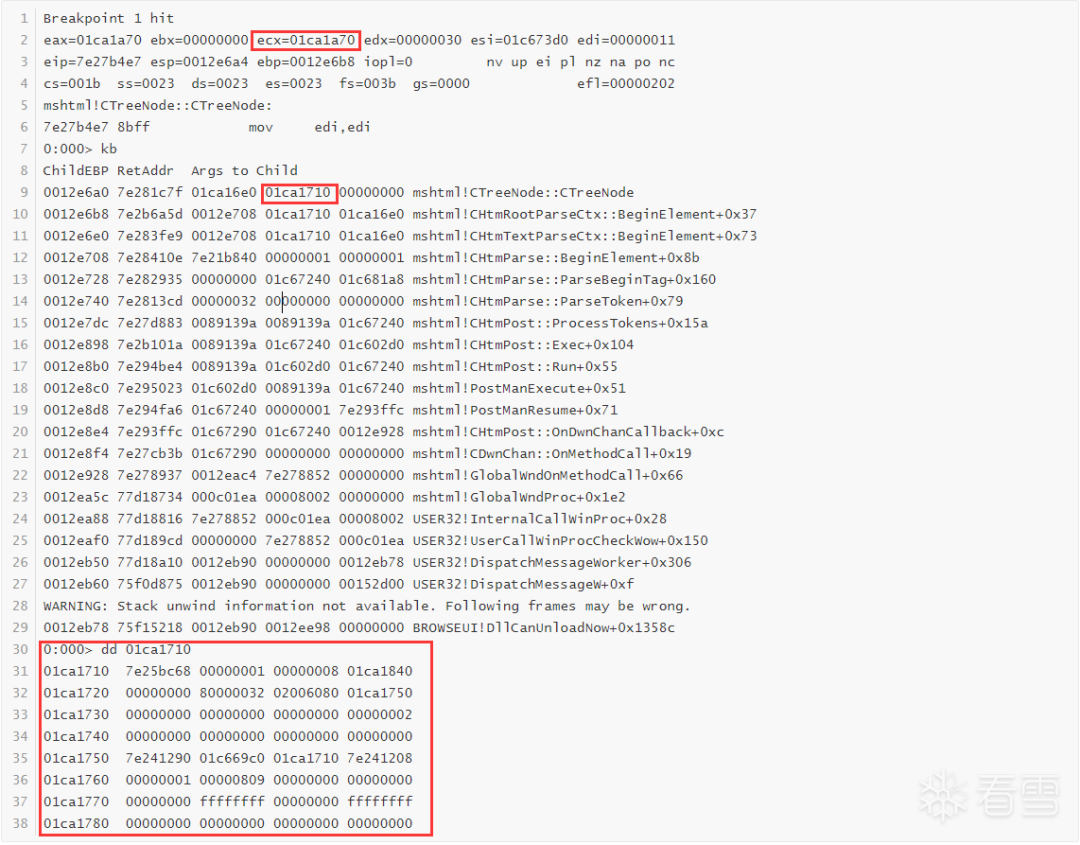 尽管已经定位到了导致崩溃的位置以及函数的调用情况,但是我们还是要进一步探索出现漏洞的根本原因的,所以有必要研究一下IE浏览器在解析这个PoC网页的时候到底出现了什么情况。