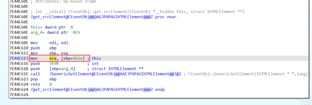 而函数 GenericGetElement 的 this 也就是 ecx 是由外界参数传入的,也就是说这个地址是可控的。