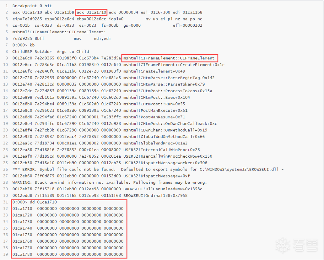 这里所获取的CIFrameElement对象指针会保存在ecx寄存器中(利用IDA结合上下调用关系可以得知),也就是地址为0x01ca1710的位置,但由于现在还没有开始创建,因此这个地址中并没有内容。