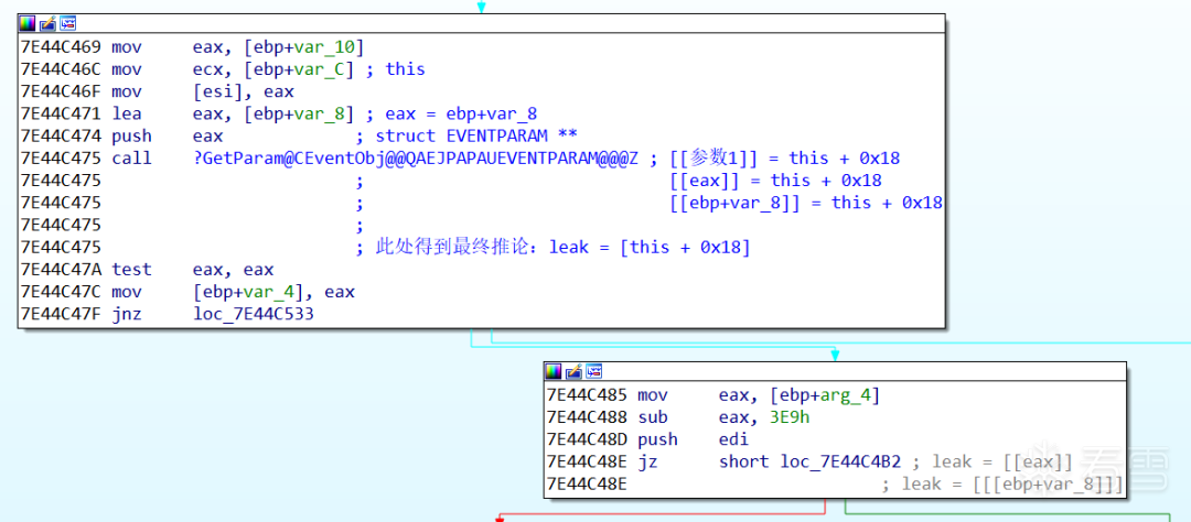 回到调用 GetParam@CEventObj 函数处,可以轻松推导出 [[eax]] = this + 0x18,结合之前的推论 leak = [[[ebp + var_8]]],可得到最终推论 leak = [this+0x18]。