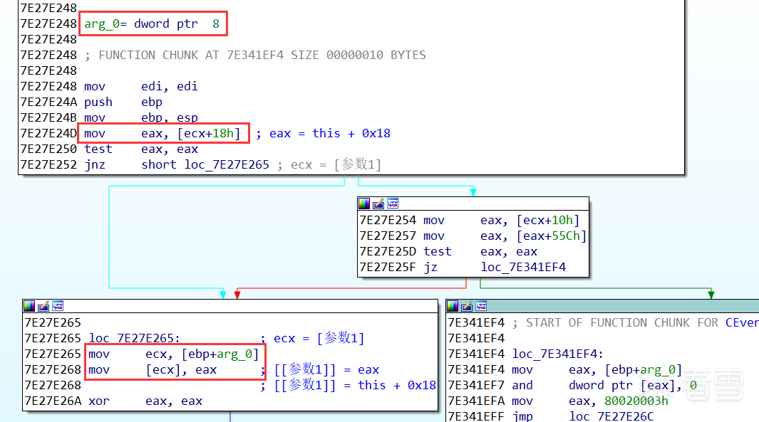 继续向上推会发现其调用了函数 GetParam@CEventObj,而这个函数将 [ebp+var_8] 作为唯一参数,显然我们需知道这个函数中是否对 [ebp+var_8] 的值进行了修改,因为是作为参数压入了栈中,下面的代码中我们需要关注的其实是 [ebp+8],通过简单的代入可得到:[[参数1]] = this + 0x18。