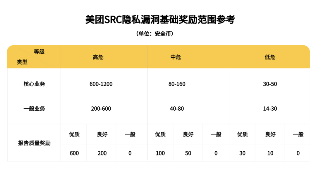 不同的隐私漏洞,根据漏洞等级不同、业务范围不同、报告质量高低不同,安全币发放不同(注:1安全币=5人民币)。