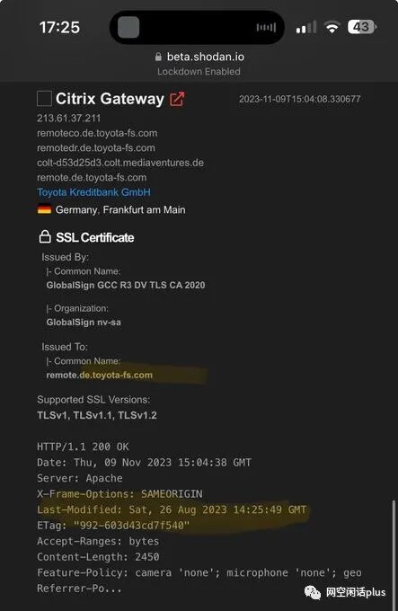 日本汽车制造商的汽车融资和租赁子公司丰田金融服务公司(TFS)最近遭受破坏性网络攻击。Medusa(美杜莎)勒索软件团伙刚刚承认对此负责。本周早些时候,TFS Europe&Africa表示,该公司“发现了系统上未经授权的活动”,这迫使该公司关闭了一些系统。TFS表示:“我们正在努力尽快让系统恢复在线,对于给我们的客户和业务合作伙伴带来的任何不便,我们深表歉意。”并补充说,该事件仅限于欧洲和非洲。这起勒索事件的影响是显而易见的,包括潜在的财务损失、监管处罚以及对公司声誉的损害,还可能会影响销售和消费者信任。运营中断还可能导致为客户和更广泛的市场提供金融服务的延迟。安全专家发文称,德国丰田金融服务公司(TFS)的的四个网站存在Citrix Bleed漏洞,大概率勒索者是利用了这个漏洞攻陷了TFS的网络。这与最近火热的工商银行的美国ICBCFS被勒索的套路如出一辙。只不过这回勒索者是Medusa。