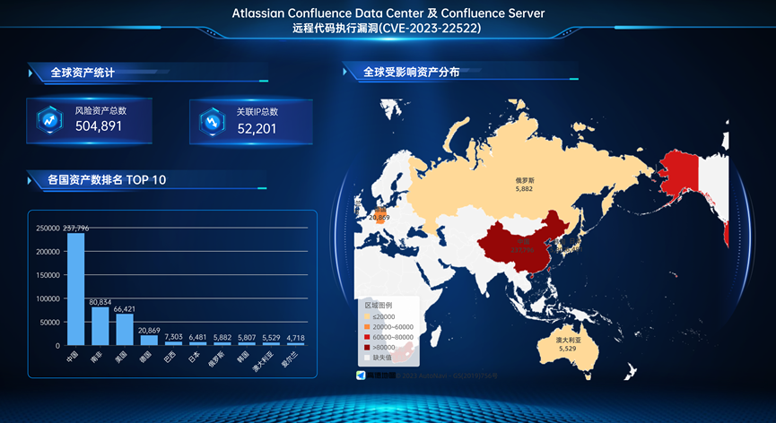 Atlassian Confluence Data Center及Confluence Server远程代码执行漏洞(CVE-2023-22522)关联的全球风险资产总数为504891个,关联IP总数为52201个。全球风险资产分布情况如下: