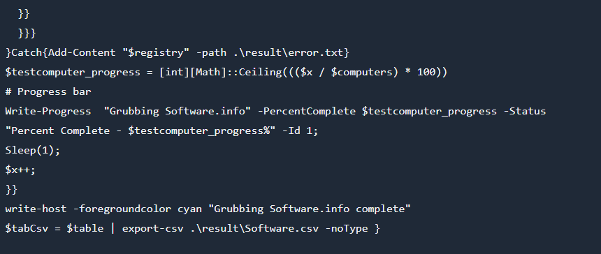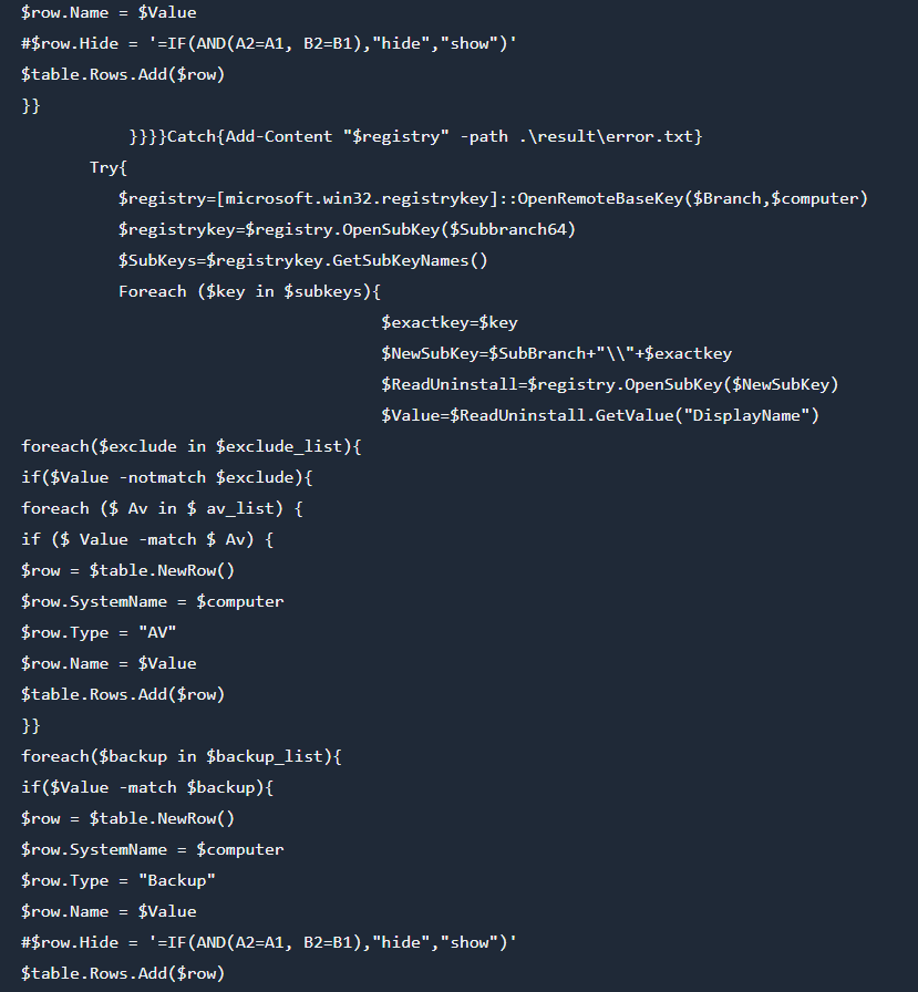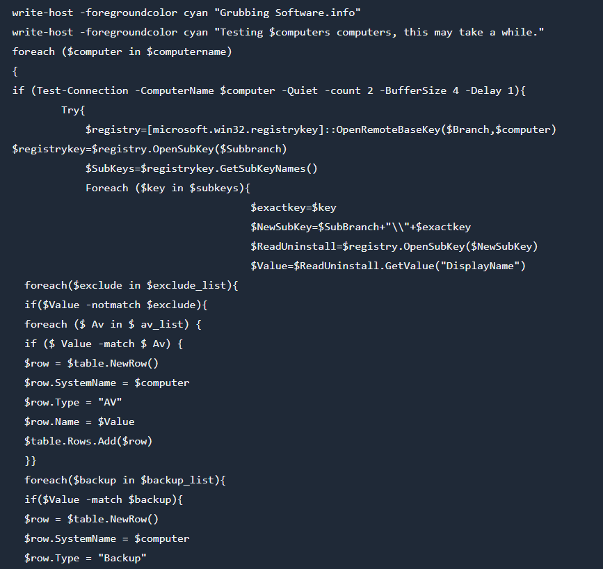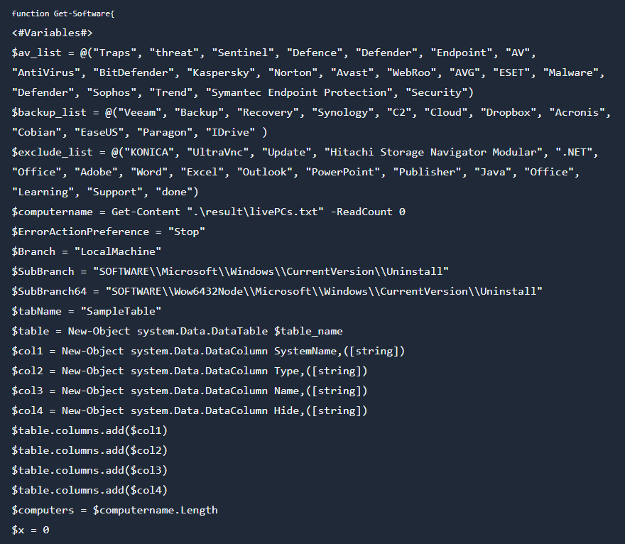 不久之后,第二个被盗的帐户被用来将一个脚本放入域服务器的本地文件夹,名为 Get-DataInfo.ps1 的 PowerShell 脚本通过 Windows Management Instrumentation 查询收集网络数据并将其发送回远程命令和控制服务器。部分脚本已从系统日志中恢复,它在网络上的计算机上搜索感兴趣的软件,包括反恶意软件和备份软件,以及其他可能干扰勒索软件加密的软件。