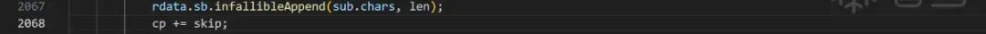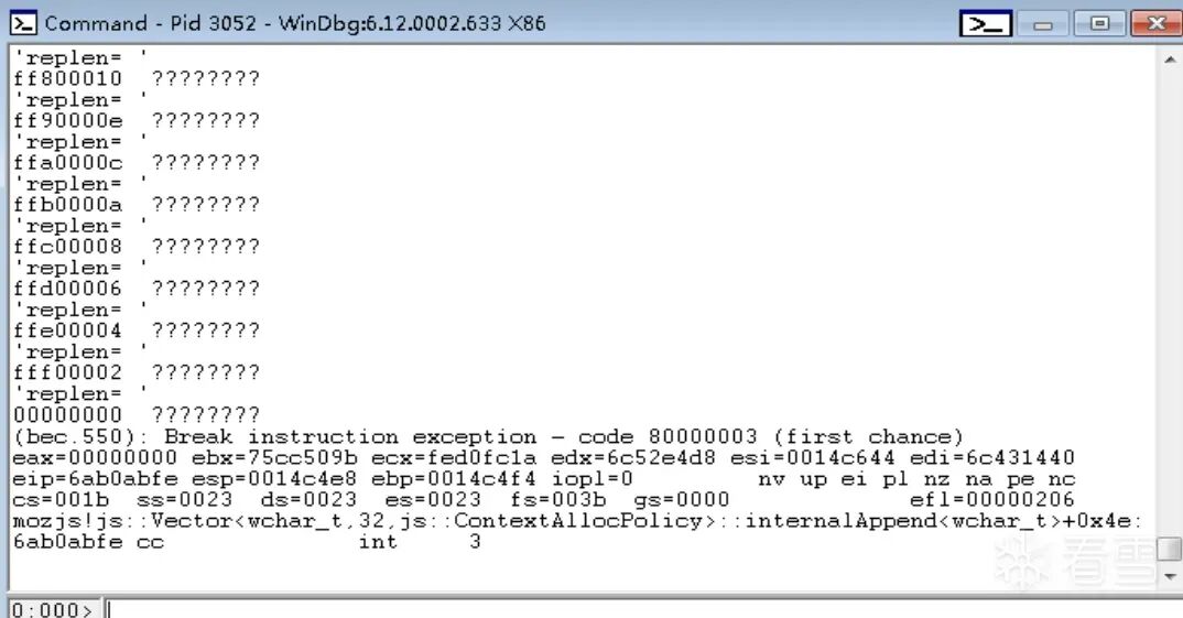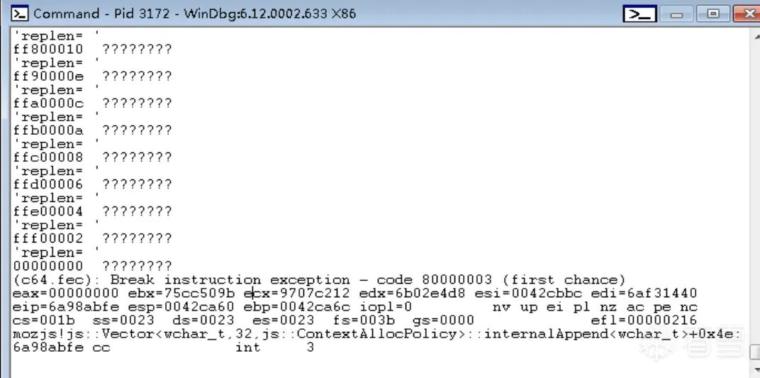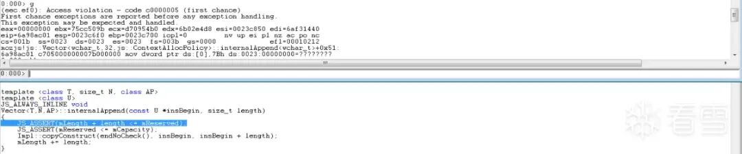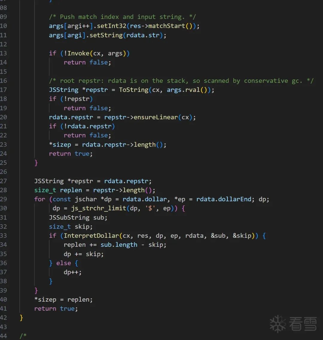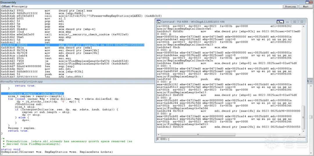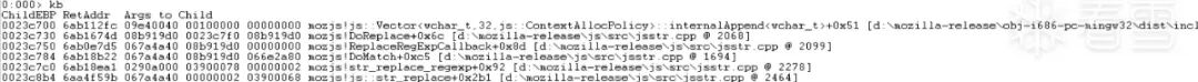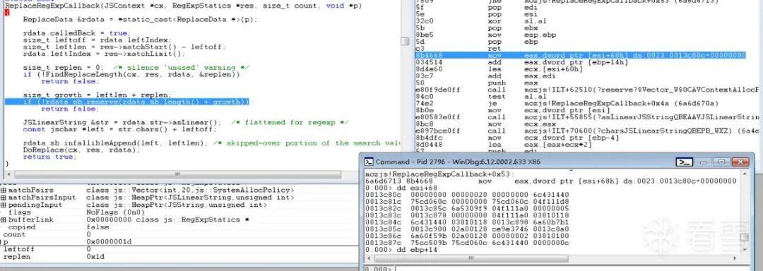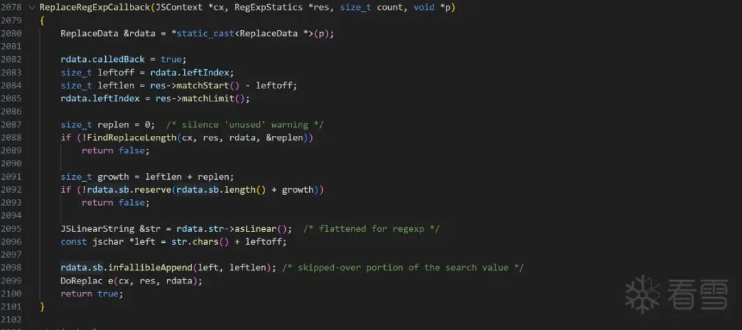 发现函数调用链为ReplaceRegExpCallback->DoReplace->Vector由于有源码,所以直接查看mozilla-release\js\src\jsstr.cpp的2067行。