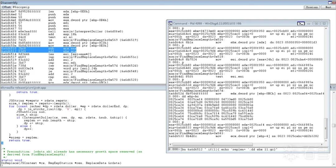 对该函数的源码分析可知,该函数有多个分支点,于是动态调试该函数重新附加进程,依旧在ReplaceRegExpCallback处设置断点,并单步执行至FindReplaceLength函数内部,多次p单步执行后发现对于该漏洞,执行在FindReplaceLength的最后一个分支。