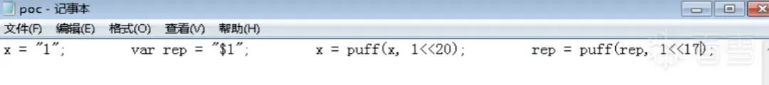 这里举个例子解释一下,比如说x=”11111″,而rep=”111″,那么y最终会等于”1111111111″,即1的个数就是最终拼接的字符串里�代表的字符串的个数,以上例子中由于有两个1的个数就是最终拼接的字符串里x代表的字符串的个数,以上例子中由于有两个1,所以由两个x拼接而成”1111111111″在这个poc中由于x中1的个数为1<<20,且$1的个数为1<<16,那么这里就可以理解为超大数额。