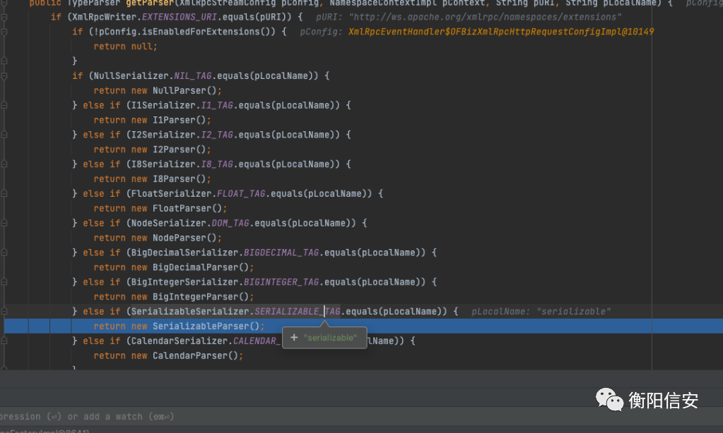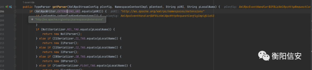 这里在返回searializableParser的时候前面会有个if,要求pURI等于http://ws.apache.org/xmlrpc/namespaces/extensions,这也就是为什么payload中会有