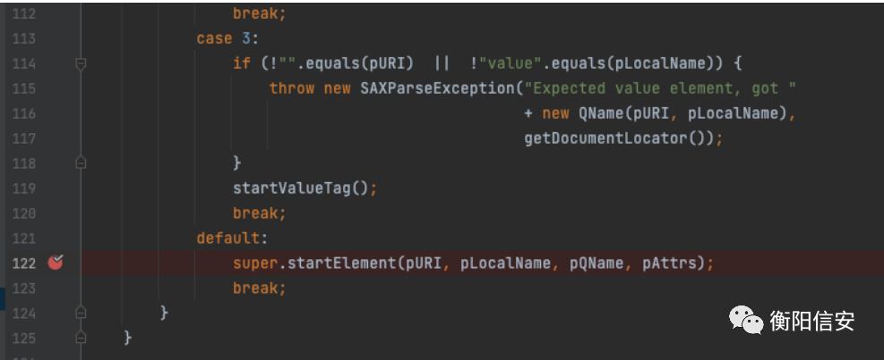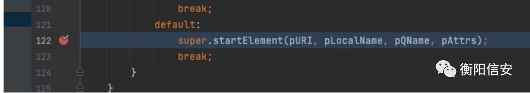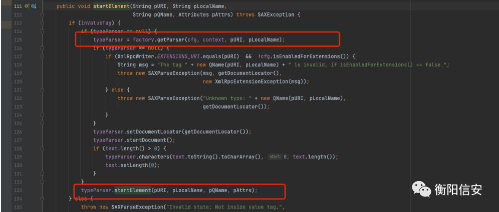接下来就是xml解析操作,包括startElement()、endElement()等。我们知道在解析器解析xml数据的过程中,会触发到scanDocument()操作对元素进行逐一“扫描”,其中就会进行startElement()、endElement()的调用,这个过程如果处理不当就会引入问题。