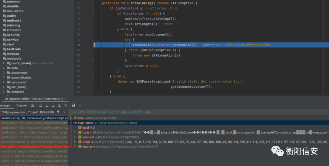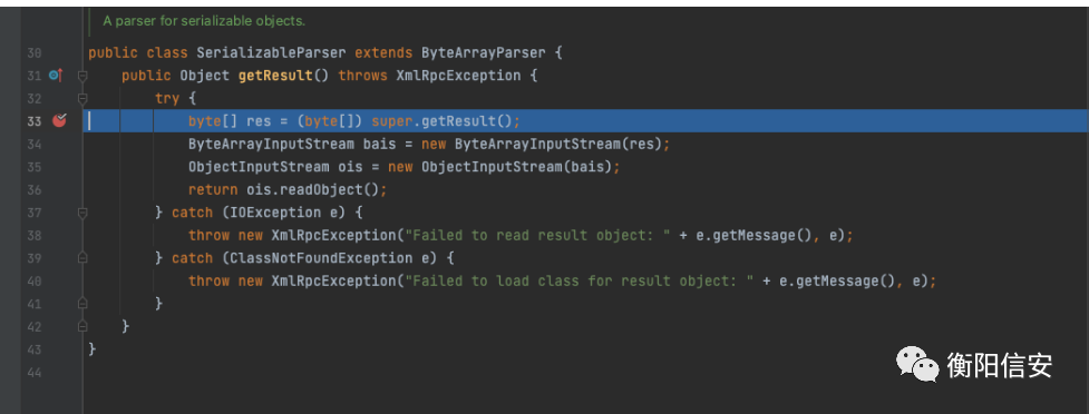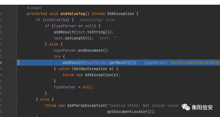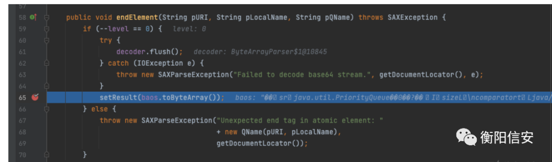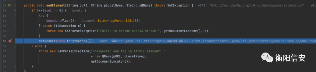 而前面我们提到的获得searializableParser,虽然直接传入可以得到base64解码器,但是在调用endElement的时候,只能调用到setResult,不能到最后getResult来触发反序列化