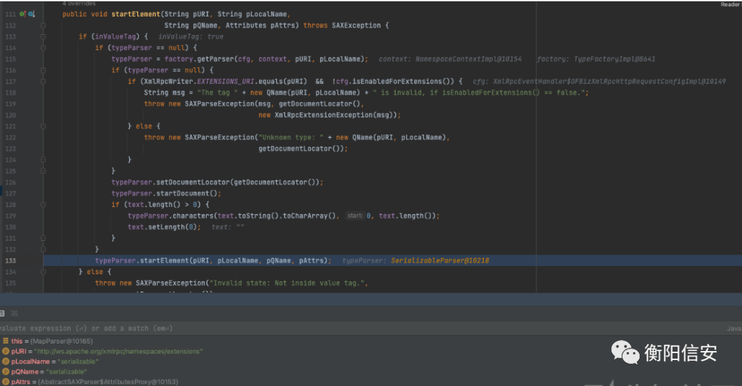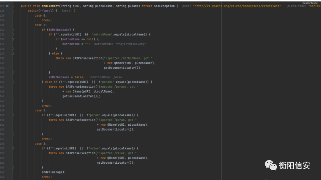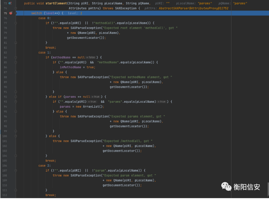 可以看到在XmlRpcRequestParser的节点解析中,前面几个默认是methodCall,methodName,params,param,这个处理过程是随着每次遍历标签进行的,当扫描完4个必须提供的标签后,会调用父类的startElement()进行处理,而typeParser就是在父类中完成赋值的,随后便通过不同的解析器进入不同的解析流程,还是会调用对应解析器的startElement,这个过程是递归的