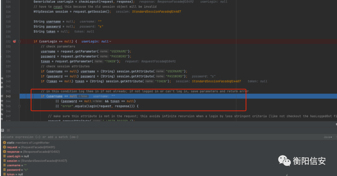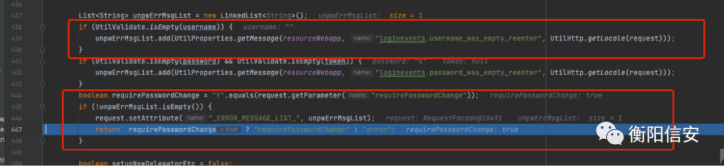 一直往下看,首先username为空的话会向unpwErrMsgList里面add一个值,然后当requirePasswordChange参数为Y的时候,因为unpwErrMsgList不为空,进入第二个框里面的if,最后三目运算符返回requirePasswordChange