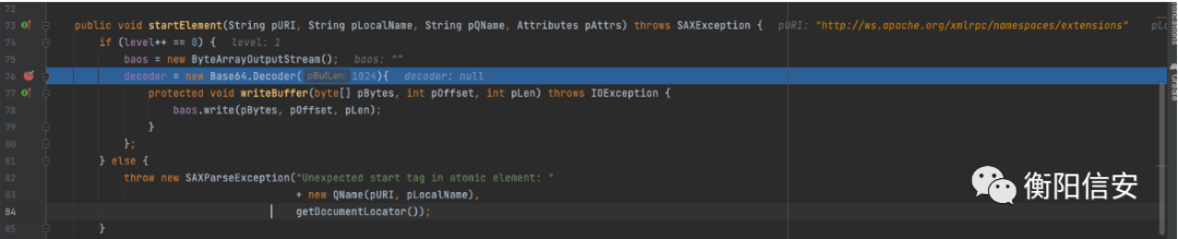 这里会创建一个base64解码器,这里应该是调用其父类ByteArrayParser的startElement