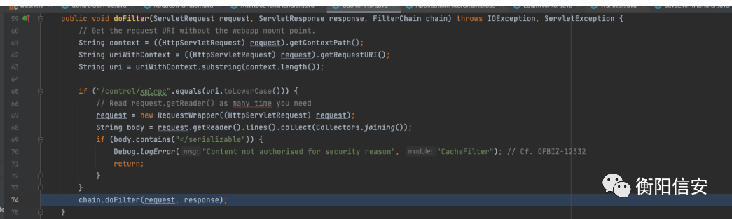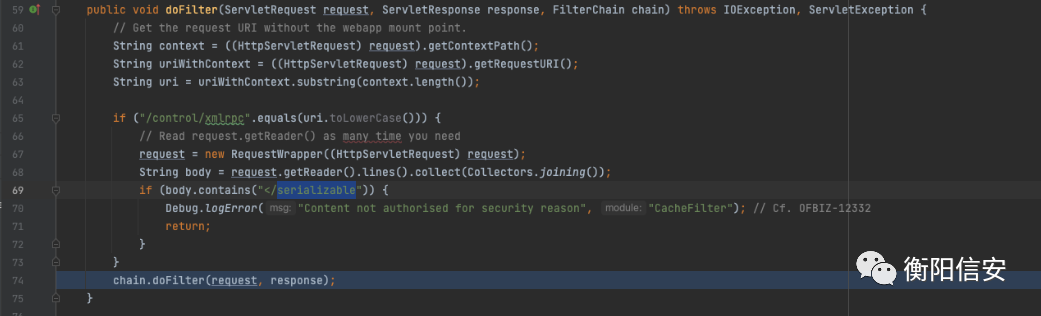 但是在下面这个漏洞中,我看到增加的东西不仅这些,可能后续还进行了增加的,在CacheFilter中还增加了对serializable标签的检查
