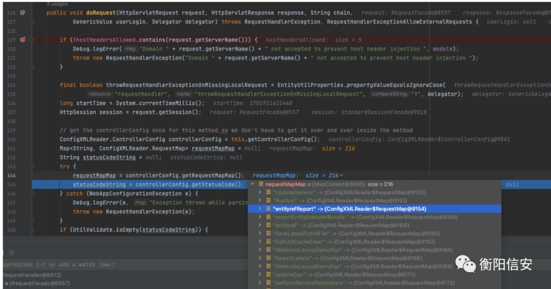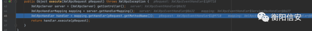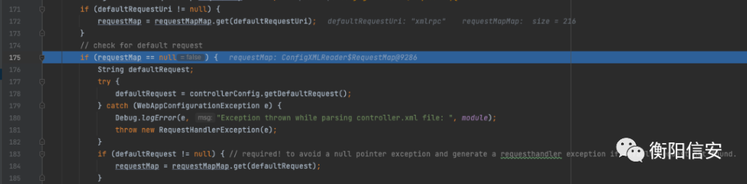 这里requestMapMap定义了216个requestMap,随后跟进访问的路径xmlrpc从Map取出对应的value的阿斗了requestMap