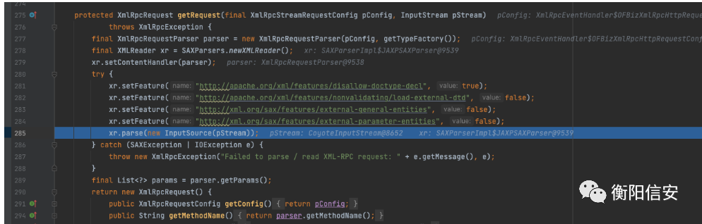 可以看到会对POST的数据使用XMLReader进行解析,以XmlRpcRequestParser为解析器,setFeature这些是为来防止XXE等外部实体解析的