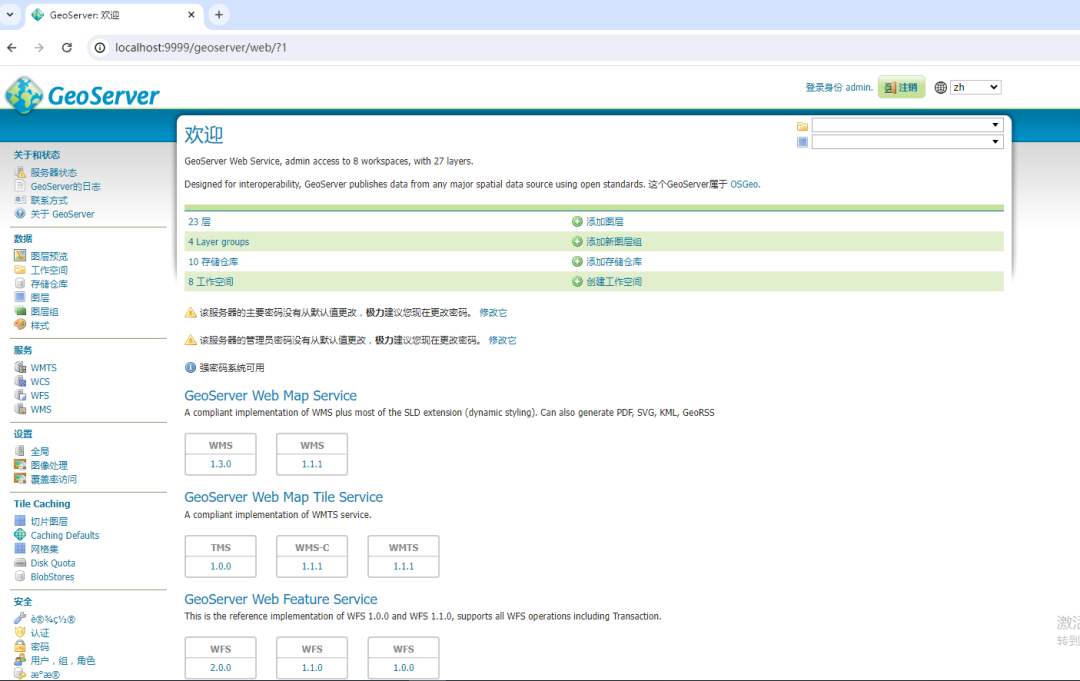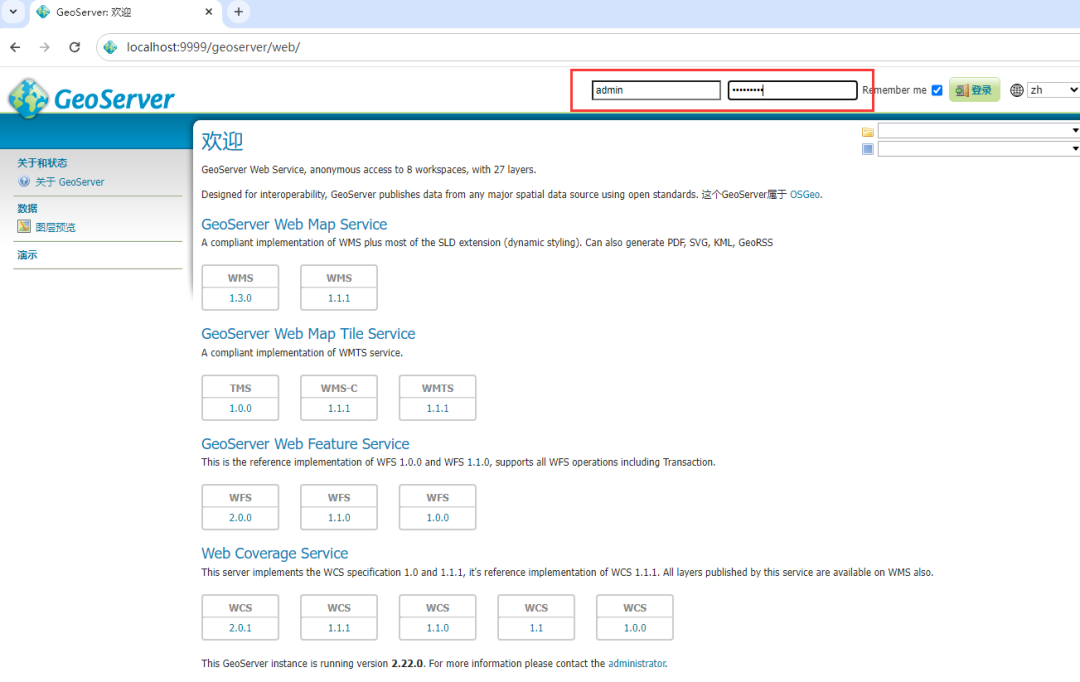 访问如下网址:http://localhost:9999/geoserver/web/,这里端口为9999是因为上面配置的时候是9999,真正访问的时候,需要根据自己配置的端口进行访。并且输入上面的账号密码:admin/geoserver,登陆进入Geoserver