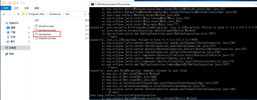 等一切安装完毕之后,GeoServer默认安装路径如下:C:\Program Files\GeoServer\bin,点击startup.bat,运行脚本,脚本运行之后,cmd不要关闭。问。