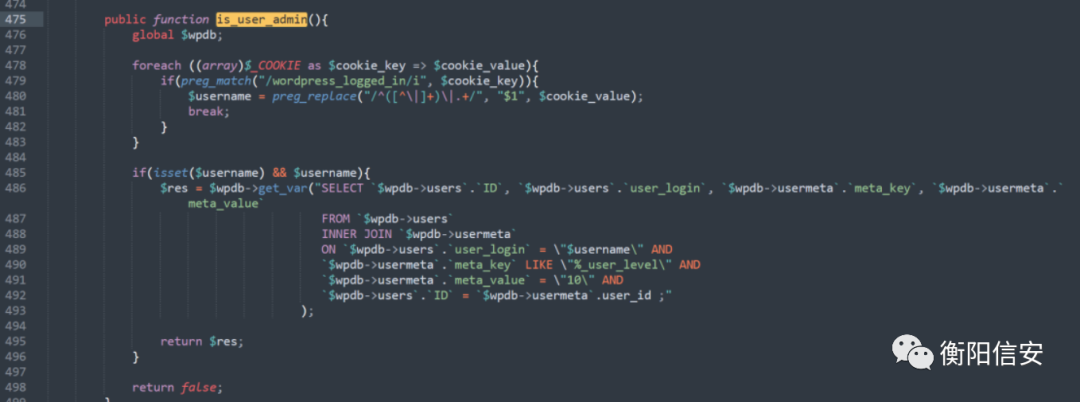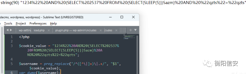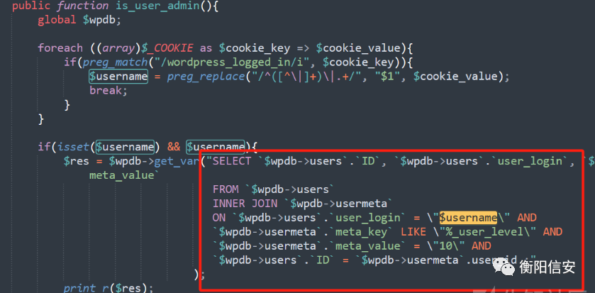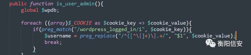 简单说就是在加载插件时,取wordpress_logged_in 第一个 | 前的字符,然后插入到 SQL 语句中。而这样也是可以匹配的,即payload