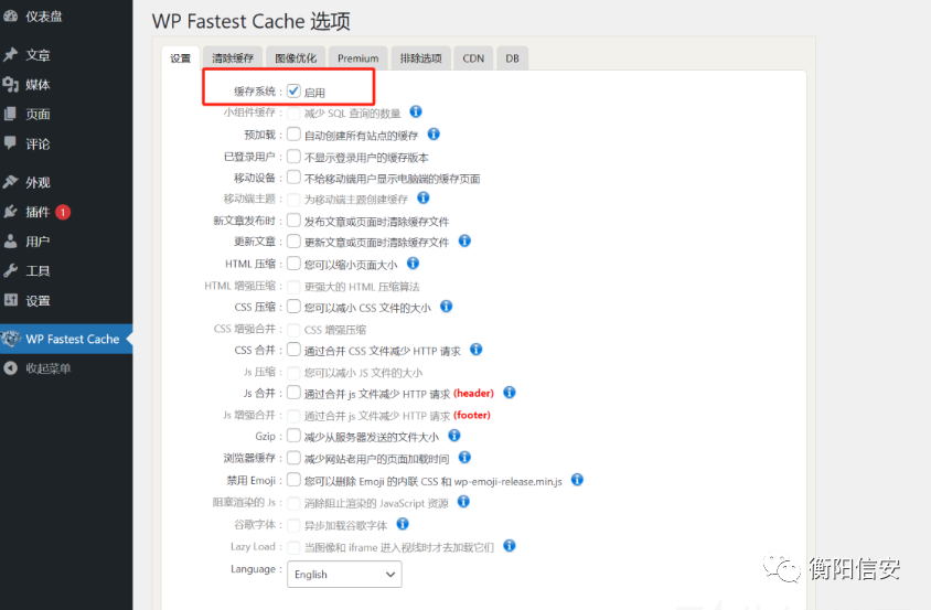 ● wordpress 版本无限制● WP Fastest Cache 插件 <1.2.2,这里使用1.2.1版本启用 WP Fastest Cache 插件,并启用“缓存系统”