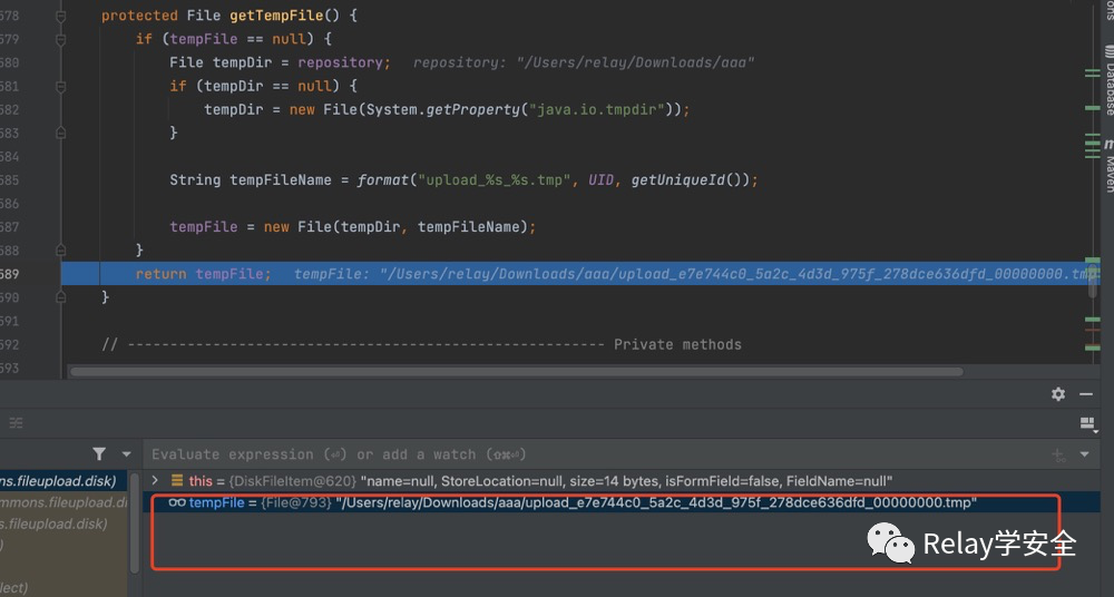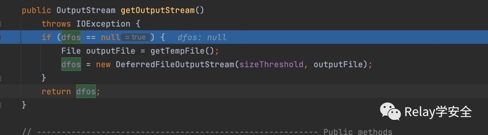 来到getOutputStream方法,首先判断dfos(就是我们的DeferredFileOutputStream对象)是否为null,这个值我们是通过反射进行赋值过得,所以接下来调用getTempFile方法。跟进去。