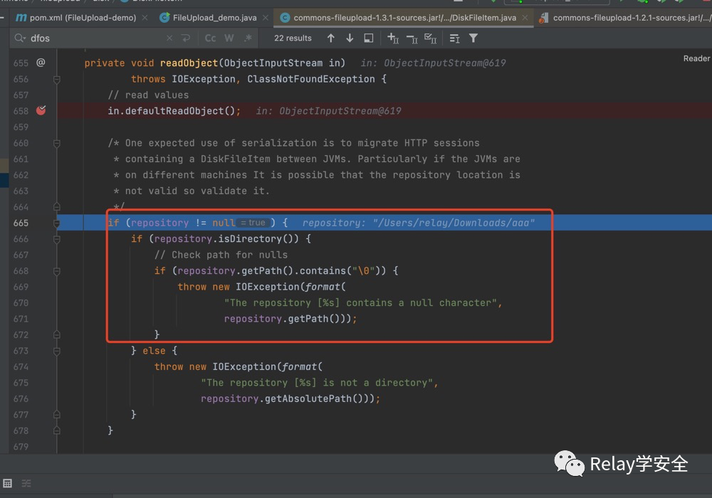 我们跟进readObject方法。首先进行了几个判断,判断我们的repository不为空的话,接着判断repository如果是目录的话,紧接着判断我们的path路径中是否有 \0 如果有的话直接抛出异常,我们的repository是通过DiskFileItem的构造函数赋值过得。他的值是我们的目录。/Users/relay/Downloads/aaa
