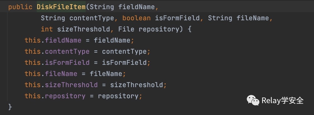 首先我们简单来看一下这个payload,可以看他他反序列化的是diskFileItem,diskFileItem是DiskFileItem类,那也就是说他会调用DiskFileItem类的readObject方法,我们跟进去看看。首先我们看到他的构造函数中对这一大堆值进行了赋值。