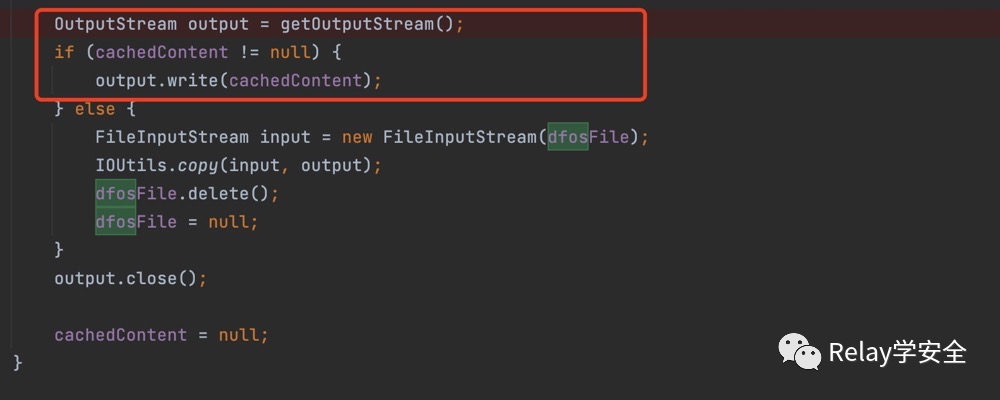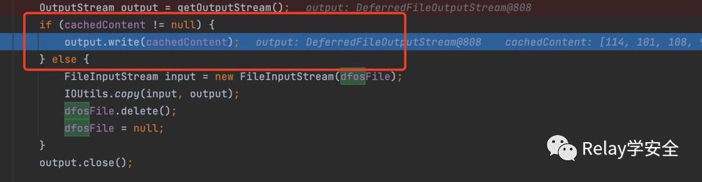 回到readObject方法,判断cachedContent如果不等于null的话,直接就将cachedContent写入,cachedContent通过反射已经给他赋值过了他的值是relay学安全。