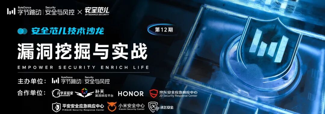 安全范儿技术沙龙由字节跳动安全与风控发起,本次沙龙也得到元亨实验室、补天漏洞响应中心、荣耀安全、京东SRC、平安SRC、小米SRC、讯飞安全的大力支持!