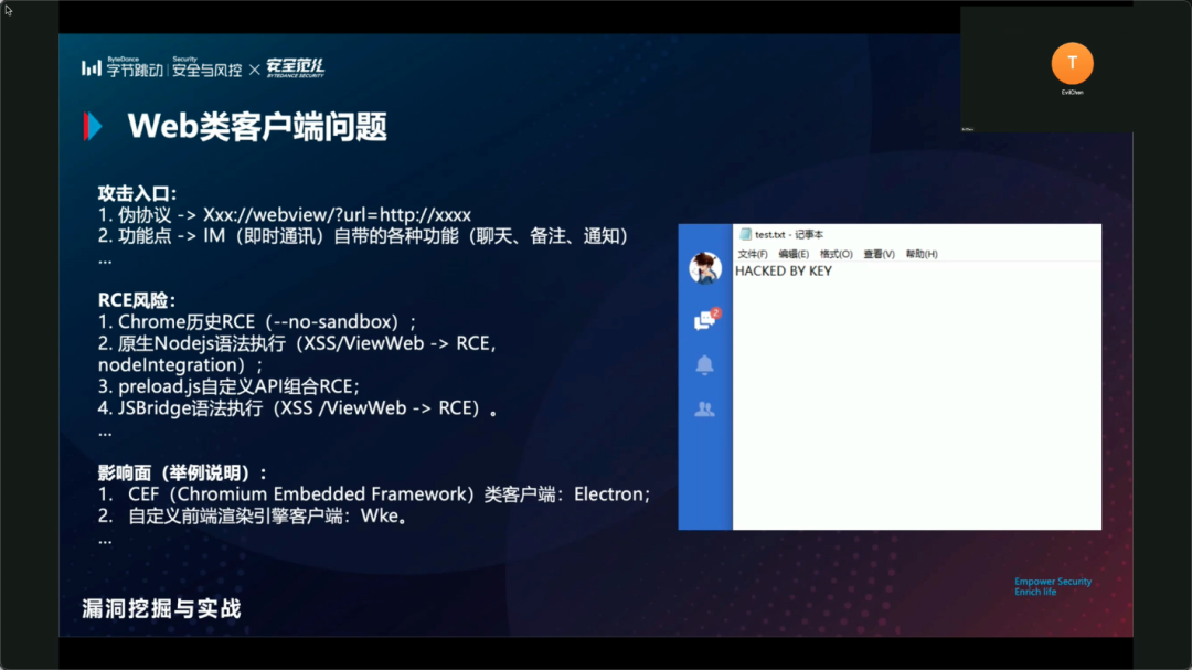 之后详细复现了某IM客户端应用的RCE、某运维平台客户端RCE、某远程服务平台客户端RCE、某视频软件客户端RCE这四个RCE案例,可谓手把手教线上的师傅们进行漏洞挖掘!直播弹幕也是频频为讲师点赞,更多RCE漏洞细节,也可以通过中孚安全技术研究