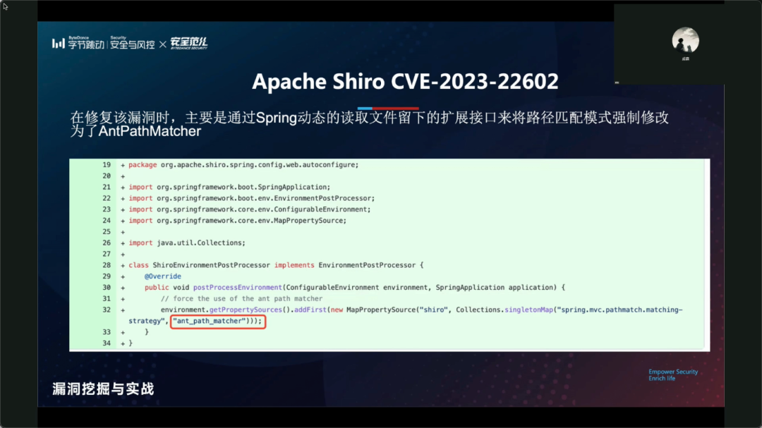 最后是来自无恒实验室的安全工程师成森,首先为大家讲述了Java Web中权限绕过案例,例如权限绕过中很容易想到getReuqestURI/URL方法,但在实际过程中,框架的路由解析代码往往要比原生的servlet更复杂,只有深入了解相关框架的解析模式,才能更好避免安全风险。