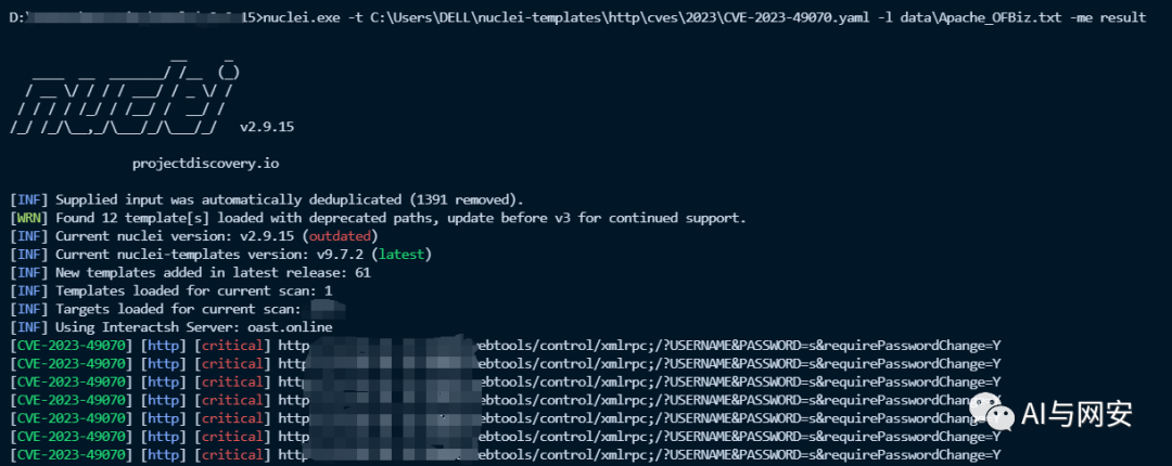 nuclei.exe -t C:\Users\DELL\nuclei-templates\http\cves\2023\CVE-2023-49070.yaml -l data\Apache_OFBiz.txt -me result
