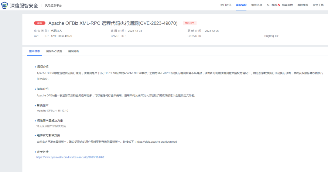 2023年12月6日,深瞳漏洞实验室监测到一则Apache OFBiz组件存在远程代码执行漏洞的信息,漏洞编号:CVE-2023-49070,漏洞威胁等级:高危。
