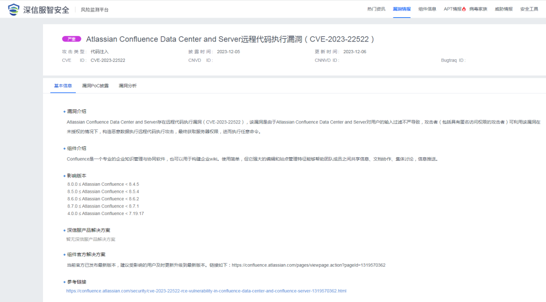 2023年12月6日,深瞳漏洞实验室监测到一则Atlassian Confluence Data Center and Server组件存在远程代码执行漏洞的信息,漏洞编号:CVE-2023-22522,漏洞威胁等级:严重。