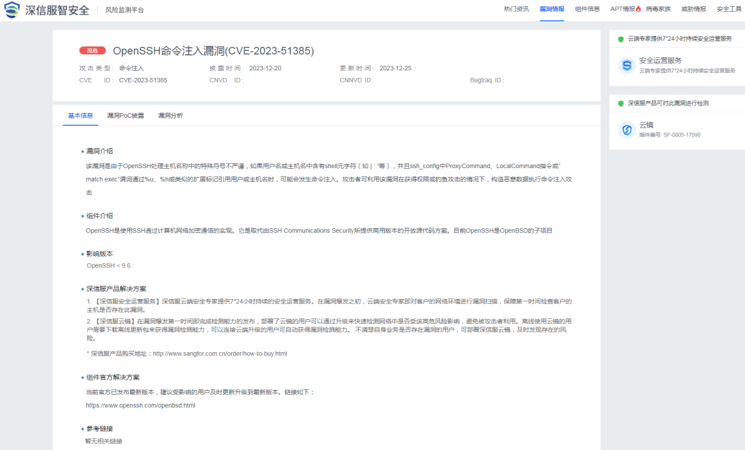2023年12月26日,深瞳漏洞实验室监测到一则OpenSSH组件存在命令注入漏洞的信息,漏洞编号:CVE-2023-51385,漏洞威胁等级:高危。