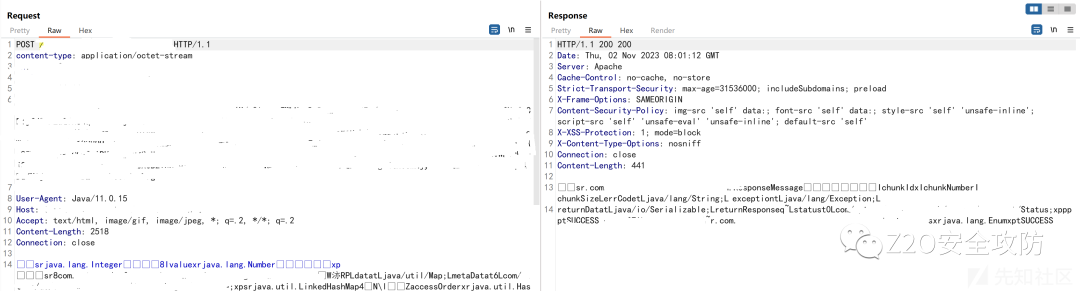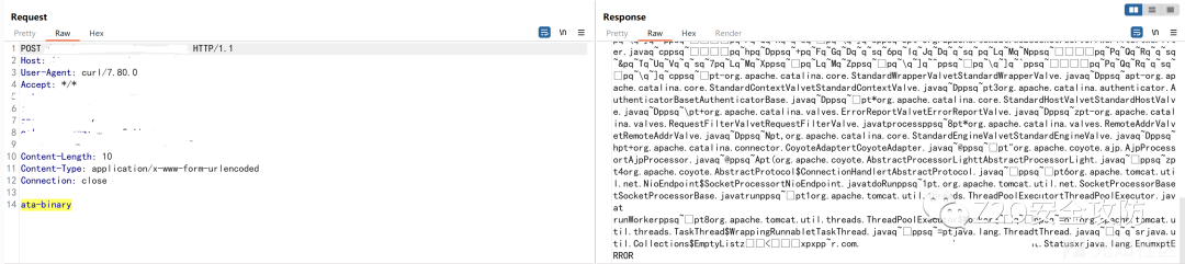 于是我先是把POST的body直接设置为ysoserial/Urldns.jar(探测gadget)的payload,但是dnslog没有任何反应。我想如果反序列化成功的话,至少应该有一个探测Windows/Linux的记录吧。可见发送的探测payload没有被反序列化成功。