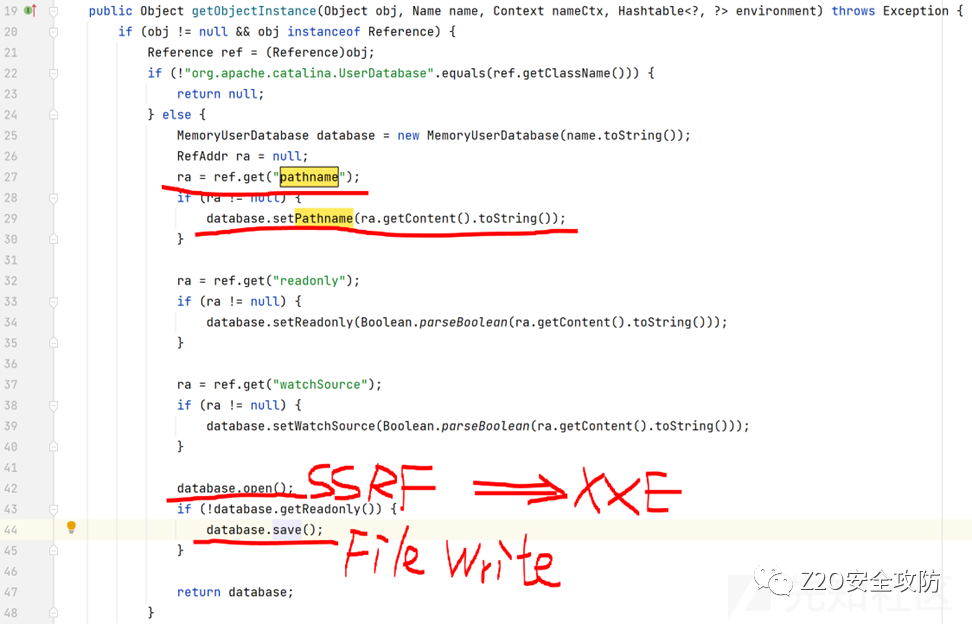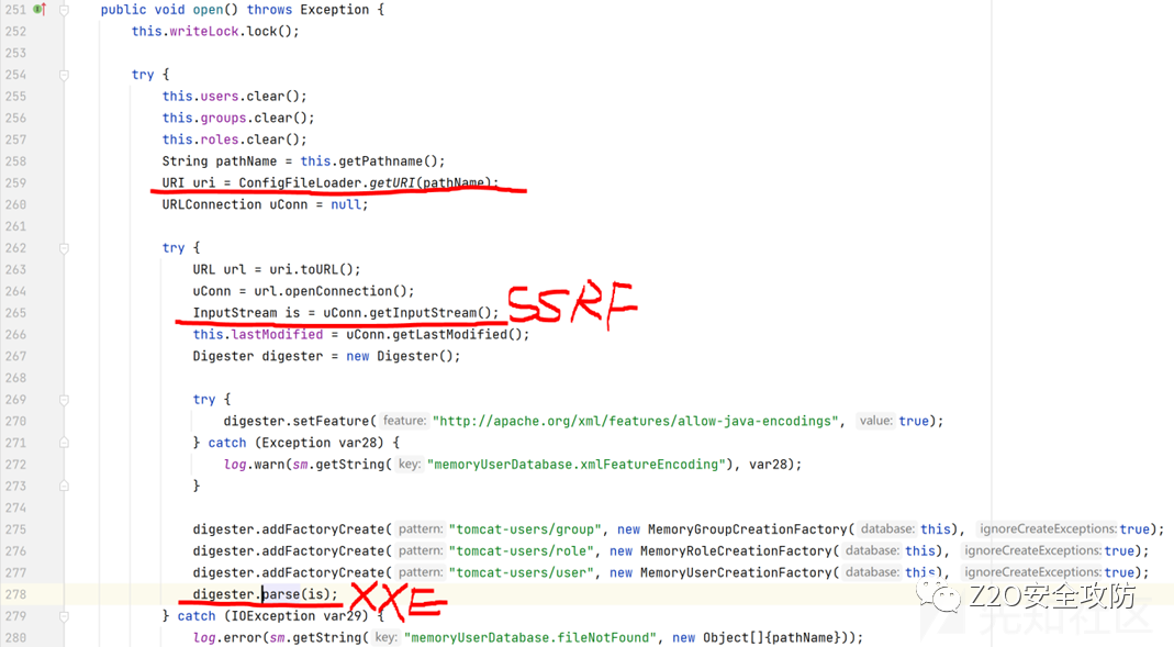先理解一下这个XXE的原理,它是后续RCE的前导。其原理是MemoryUserDatabaseFactory设置pathname,后续会转换成URL,然后进行database#open()的时候,从pathname指定的URL中取得xml内容进行解析。可以说是blind SSRF=> blind XXE。